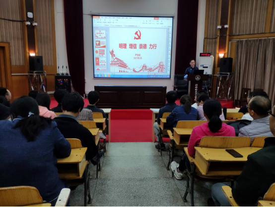 为深入推进党史学习教育开展,5月20日下午,fun88乐天使组织全体教师和学生党员在致远楼108室集中听取专题党课《明理 增信 崇德 力行》,fun88乐天使党总支党务工作负责人尹剑武同志主讲党课。