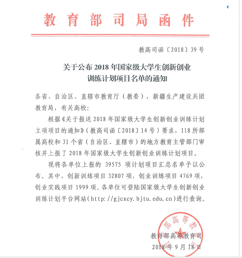 关于公布2018年国家级大学生创新创业训练计划项目名单的通知