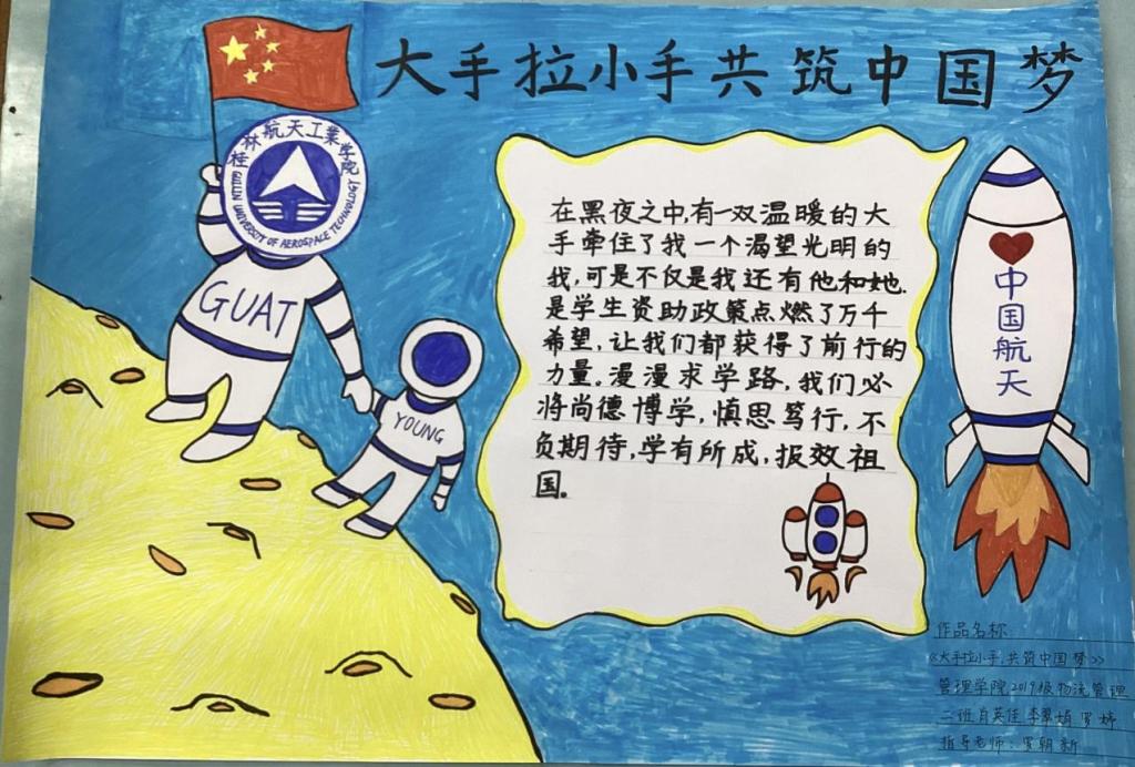 作品简介:作品以航空航天为背景,画中的大航天员举着国旗拉着小航天员的手在月球上探索,代表着在党和国家的政策点燃了万千学生的希望,使学生获得了前行的力量;火箭代表了神州十三号发射成功,也预示着神州十四号发射任务可以取得圆满成功,同时也象征祖国的航天事业迈向光明的未来。