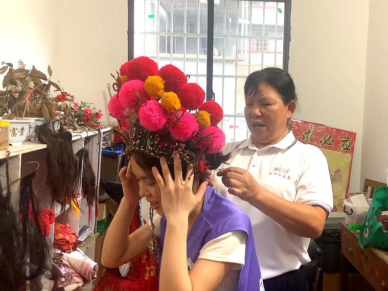 2017年,灵川桂剧列入桂林市级非遗代表性项目名录,因戏台过于老旧,当地政府和剧团成员们共同将新的戏台搭建起来。“戏台不能含糊,演出时一旦下雨,得保证唱戏的服饰不能湿,否则像凤冠帽这种道具,会遭到严重损坏。由于当时没有钱,老人们就自己掏钱买衣服妆发,服装道具太贵,团队老人们就自己做。都是凭着大家的热爱我们的桂剧才走到今天” 秦红英向大家讲到。传承这条路难走,传承人不好找,戏曲人肩上担子重。每一个愿意宣传桂剧,宣传非遗的人,其实都是传承人。