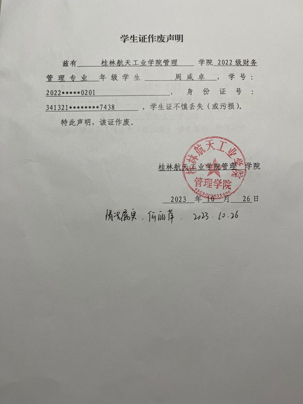 周咸卓学生证作废声明