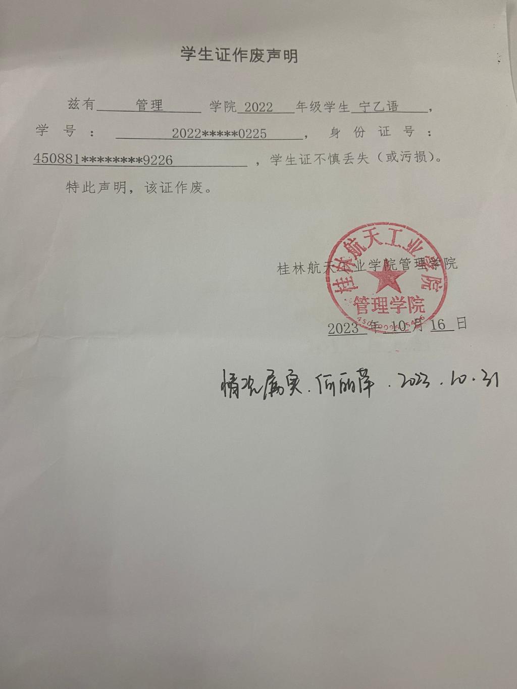 宁乙语学生证作废声明