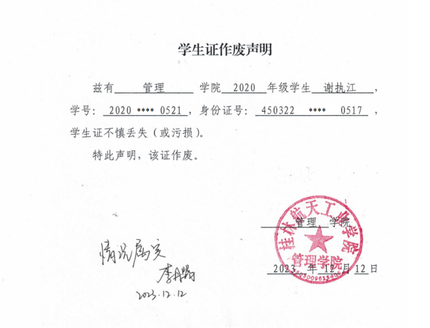 谢执江学生证作废声明