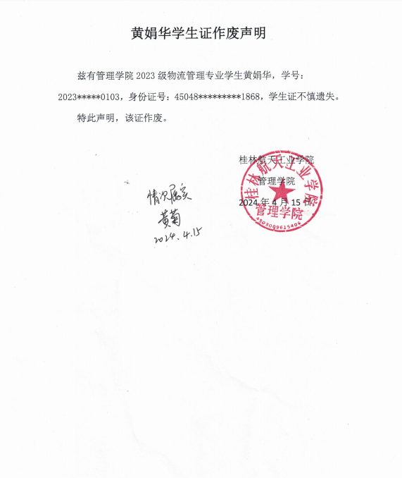 黄娟华学生证作废声明