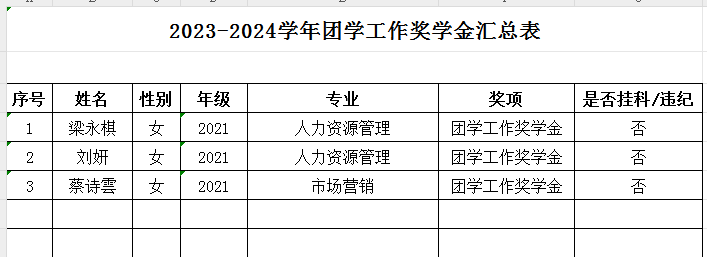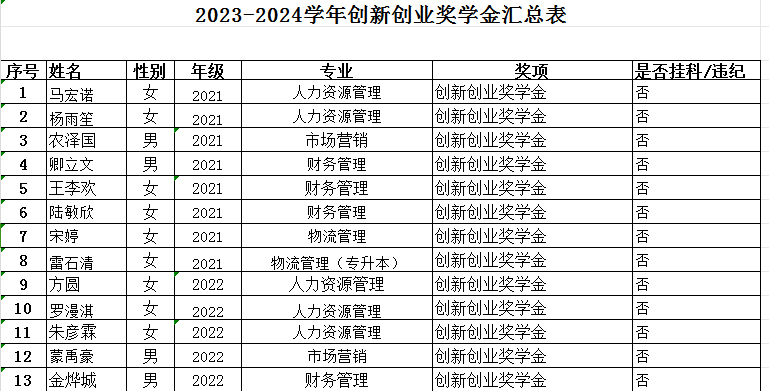 根据学校《关于开展2023-2024学年综合素质测评工作、校内评奖评优工作的通知》和《桂林航天工业学院学生奖励管理办法》(桂航学﹝2020﹞19号)文件精神,参照2023版《学生手册》的相关规定和要求,我院校内评奖评优评议小组组织开展了评审工作。现将评审结果予以公示,拟推荐2022级人力资源管理3班等6个班级申报先进班集体,卢金萍等454名学生申报2023-2024学年学习优秀奖学金,马宏诺等13名学生申报2023-2024学年创新创业奖学金,梁永棋等3名学生申报2023-2024学年奖学金,李红等271名学生申报2023-2024学年三好学生,洪艺婵等54名学生申报2023-2024学年单项奖,公示期为2024年9月30日-2024年10月9日(3个工作日)。