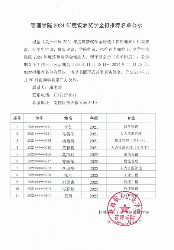 根据《关于开展2024年度筑梦奖学金评选工作的通知》相关要求,经学生申请、班级评议、学院推选,拟推荐李如等11名学生为我院2024年度筑梦奖学金候选人。现予以公示(名单附后),公示期3个工作日,公示期为2024年11月18日- 2024年11月20日。如对拟推荐名单有异议,请以书面形式并署真实姓名,于2024年11月20日前向学院学工办反映。
