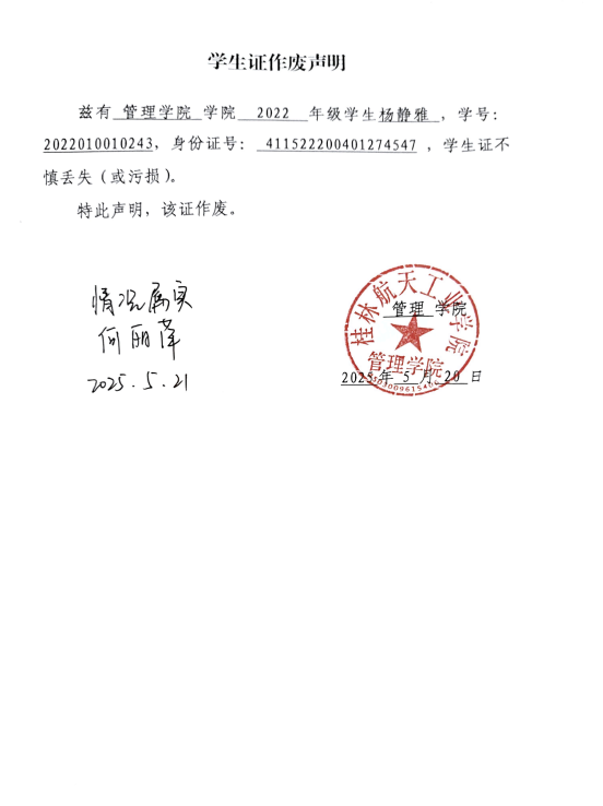 杨静雅学生证作废声明